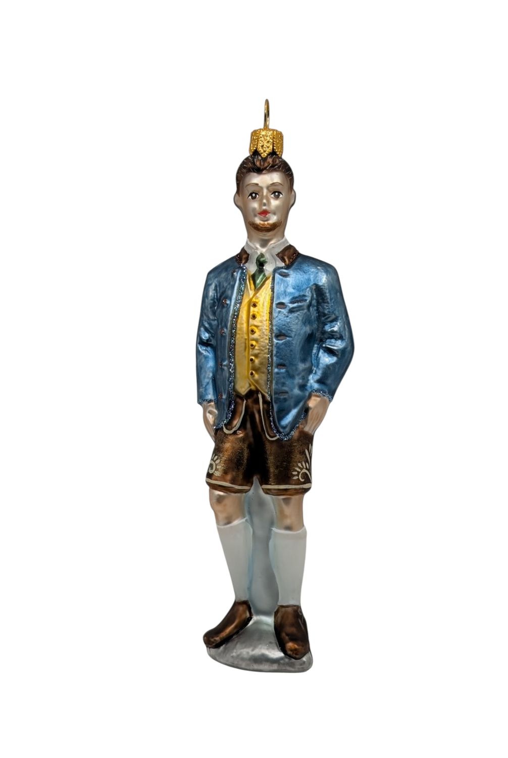 Dieser aufwendig handgefertigte Christbaumschmuck vereint österreichische und bayerische Lebensfreude mit feinstem Kunsthandwerk. Die Figur zeigt einen Mann in klassischer Tracht mit Lederhose, gefertigt aus mundgeblasenem Glas und anschließend liebevoll von Hand bemalt.