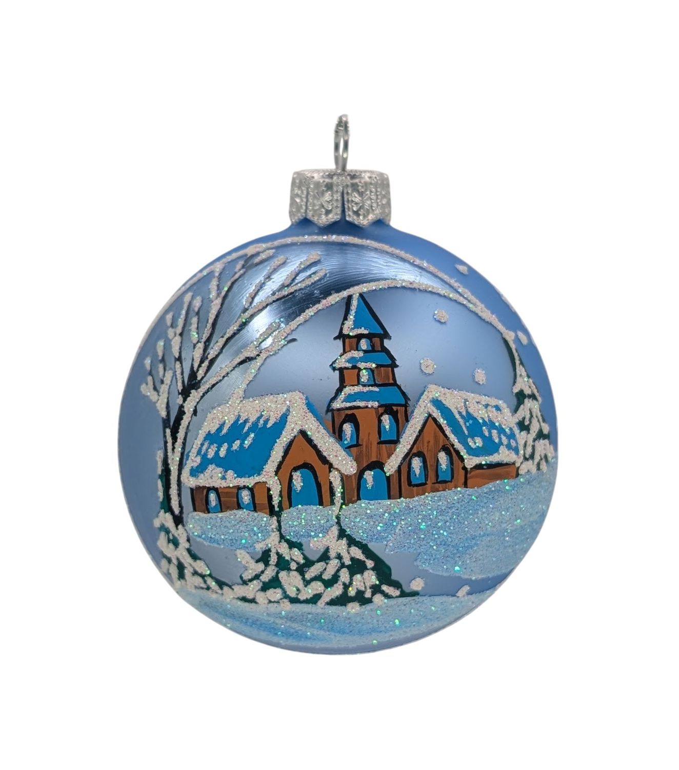 Diese edle, handbemalte Christbaumkugel aus Glas entführt in eine idyllische Winterwelt. Auf dem zart schimmernden hellblauen Untergrund erstrahlt eine malerische Schneelandschaft mit einem verschneiten Dorf, funkelnden Tannen und einer kleinen Kirche, die in feinem Glitzerdetail liebevoll ausgearbeitet sind.