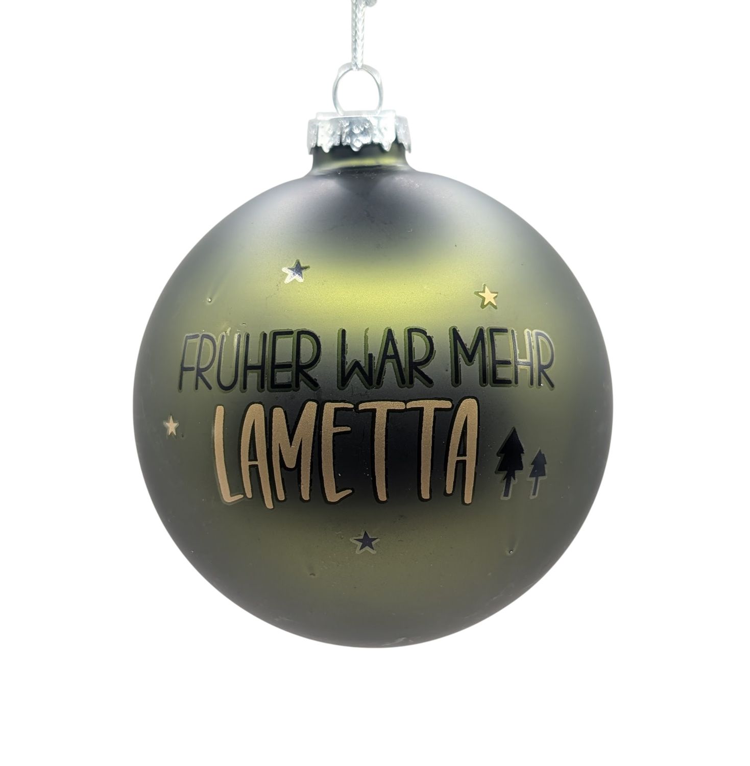 Diese stilvollen grünen Glaskugeln verbinden klassische Eleganz mit einem charmanten Retro-Spruch, der sofort für ein Schmunzeln sorgt. Der Satz „Früher war mehr Lametta“ erinnert humorvoll an vergangene Weihnachtszeiten und bringt ein Stück Tradition zurück in die moderne Festdekoration.